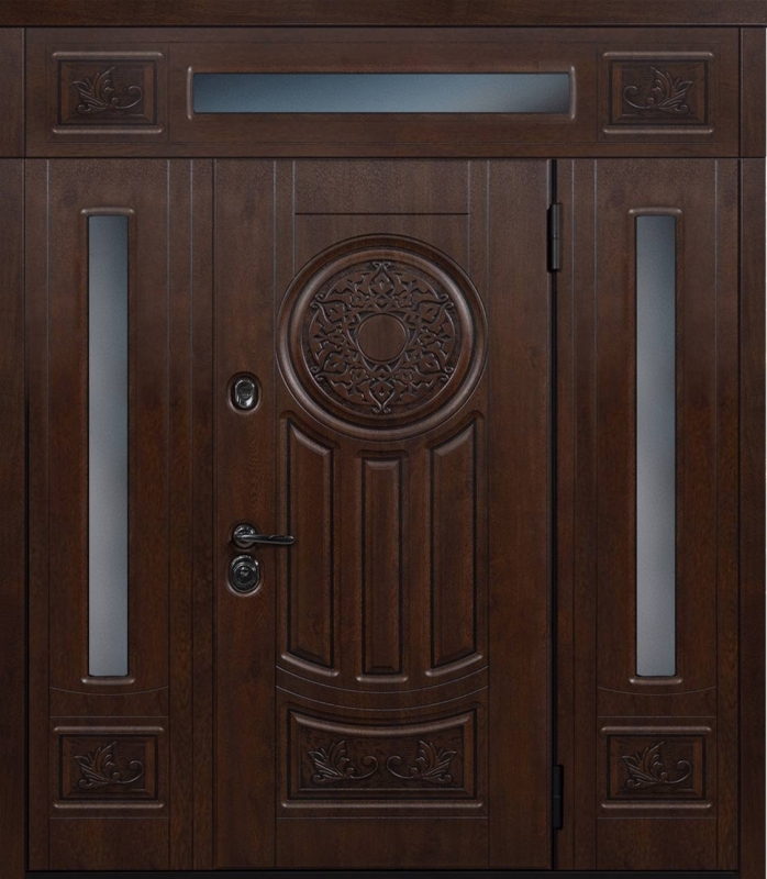 Эта нестандартная парадная дверь с фрамугой №6 — отличный выбор для тех, кто ценит элегантность и долговечность. Внешняя и внутренняя отделка из МДФ придает дверям стильный и современный вид, а также защиту от механических повреждений. МДФ устойчива к царапинам и вмятинам, что делает дверь идеальной для долгосрочной эксплуатации. Каркас из профильной трубы 50х25 мм и лист металла толщиной 2 мм обеспечивают прочность и надежность, а ребра жесткости из профильных труб гарантируют дополнительную устойчивость. В двери установлены блокираторы, два контура уплотнителей из резины, что повышает звуко- и теплоизоляцию. Замки от известных производителей, таких как Просам и Мосрентген, обеспечат надежную защиту. Возможность комбинировать отделку, добавлять зеркало, стеклопакет или кованые элементы позволяет легко адаптировать дверь под любые предпочтения. Нестандартная парадная дверь с фрамугой №6 от производителя: быстрое изготовление и монтаж в Черноголовке, индивидуальные размеры, широкий выбор материалов и фурнитуры, официальная гарантия до 10 лет.